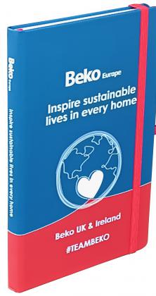 Colour match the cover with printed paper over board application with a matt anti-scuff lamination. Full colour print to the front, spine and back cover before the book is assembled. Price includes full external print with 192 WHITE sewn pages (ruled, squared or plain layout) or 192 IVORY sewn pages (ruled or dotted layout) – all with "page date" mark. (Certified Sustainably Sourced), elastic closure, elastic pen loop and a ribbon bookmark. Optional extras include choice of recycled paper, fasteners, rear pocket, tip in pages. Size 130 x 209mm.