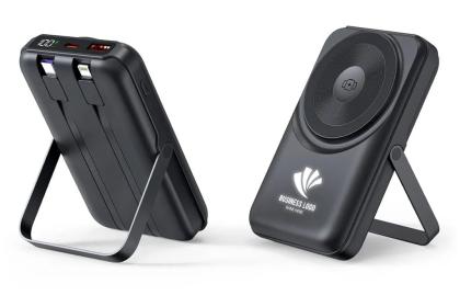 This 10,000 mAh MagSafe-compatible power bank features 15W wireless charging, watch charging, built-in USB-C & Lightning cables, and an illuminated logo.