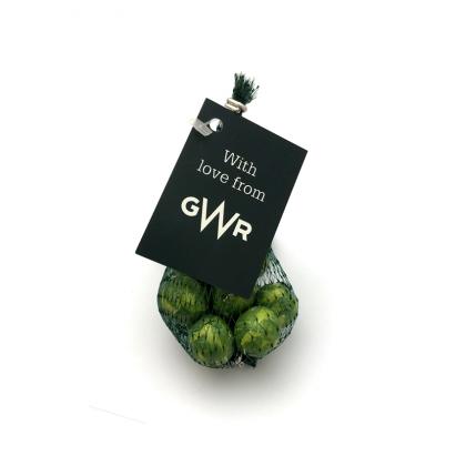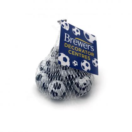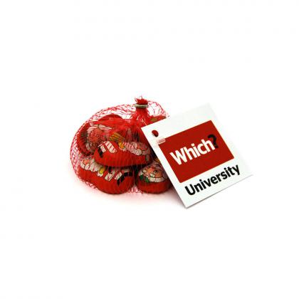 Milk chocolates and sweets netted with a bespoke branded tag. Net available in blue, red, yellow, white and green.