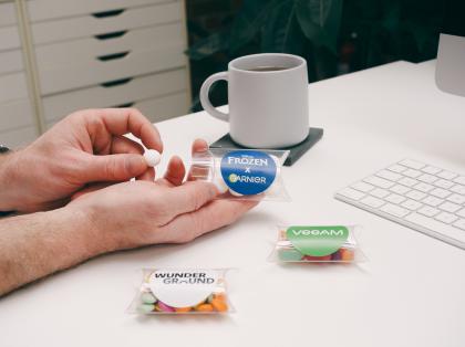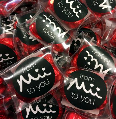 Branded clear pillow boxes filled with milk chocolate or sweets and branded with a sticker.