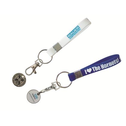 Silicone Band Trolley Coins give you the same practicality of our other trolley coins, but with the added benefit of a funky Silicone Band attached.Enamelled coin and printed band.Available in the dimensions of one pound or one euro coin and supplied with a spring clip and split ring fitment.Pantone matched colours.