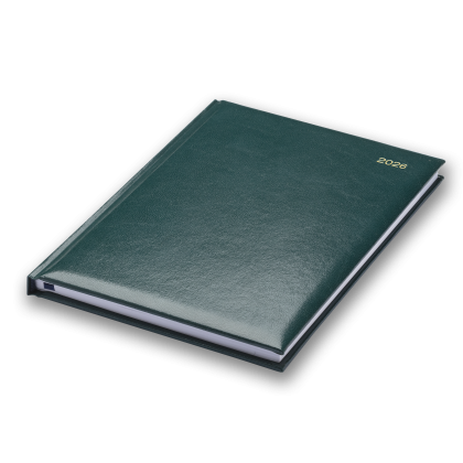 12 Month Diary. White Pages. Padded Cover. Ribbon Marker. Daily Historical Facts. Head and Tail Bands. Section Sewn. Perforated Page Corners. Size: 145x205mm. Cover Available in Black, Blue, Burgundy, Green, Mid-Blue, Red. Minimum Quantity: 25.